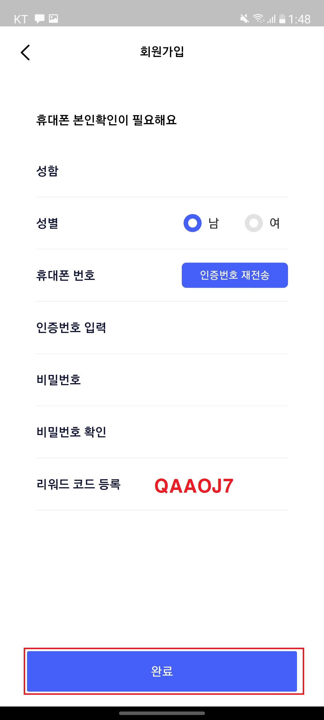 - 성함, 성별, 휴대폰번호, 인증번호 입력, 비밀번호, 비밀번호 확인, 리워드 코드 등록(QAAOJ7) 입력 후 완료
