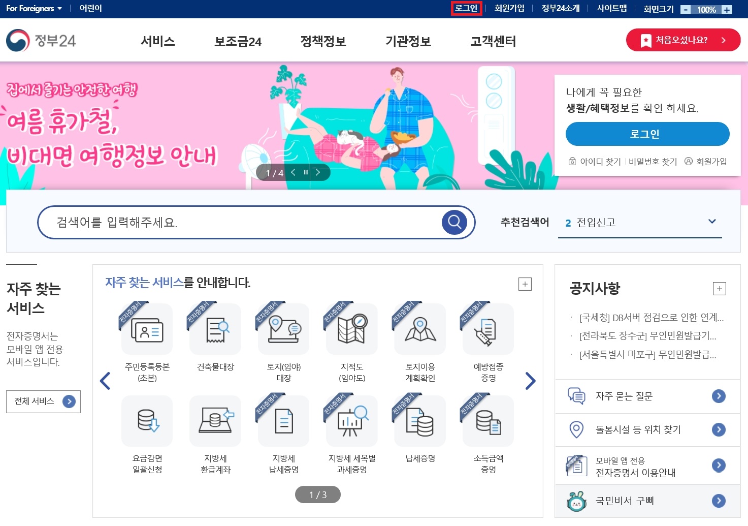 - 정부24 접속 후 상단에 "로그인"을 선택 합니다.