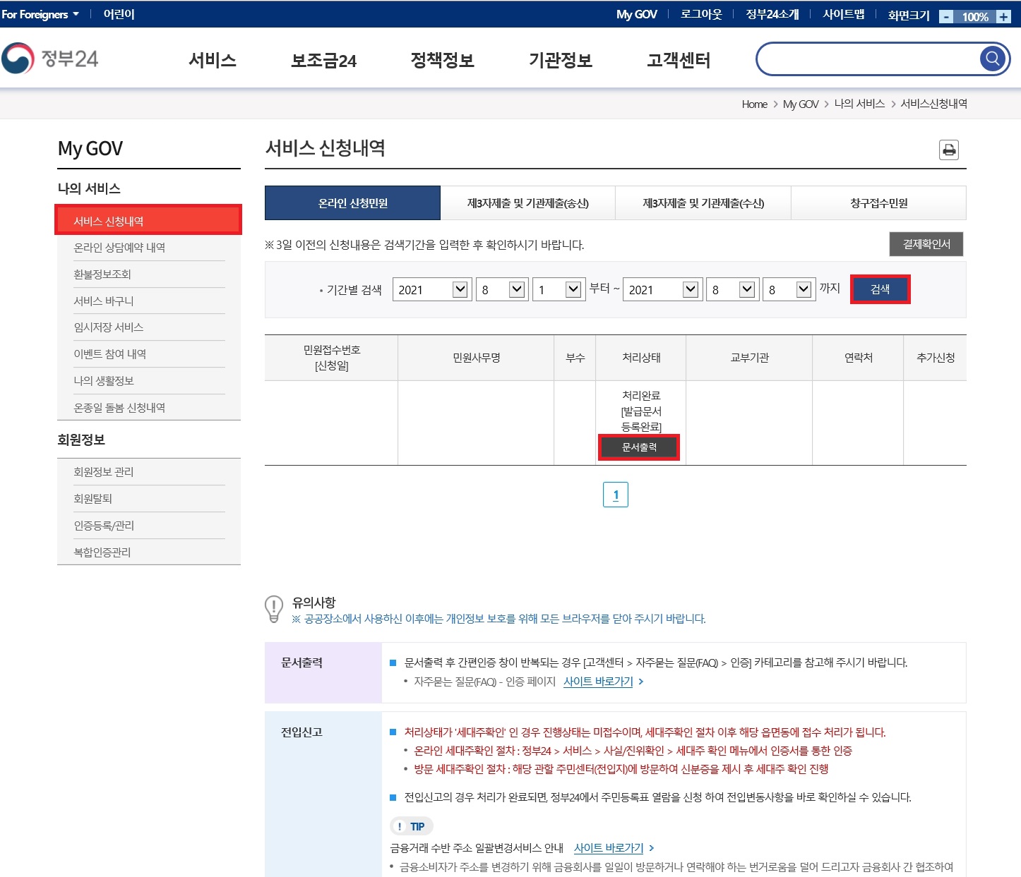 - 서비스 신청내역 - 신청일자 지정 후 검색 - "문서출력"을 선택하여 프린터 출력을 진행 합니다.