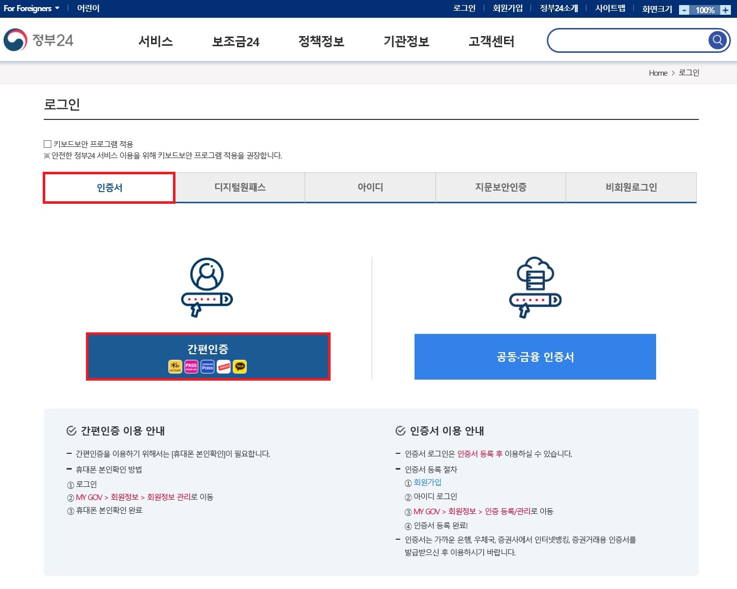 - 글쓴이의 경우 "간편인증"를 통하여 로그인을 진행하였다.
