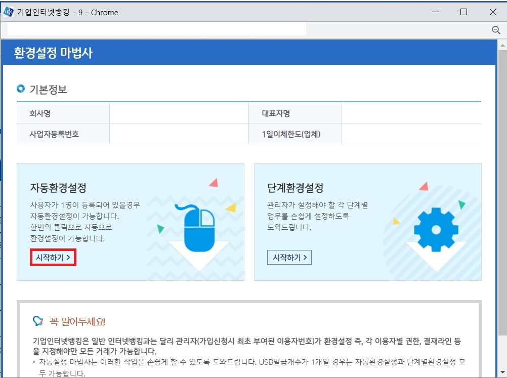 - 이용자정보에 체크 후 "환경설정 시작하기"를 선택 합니다.