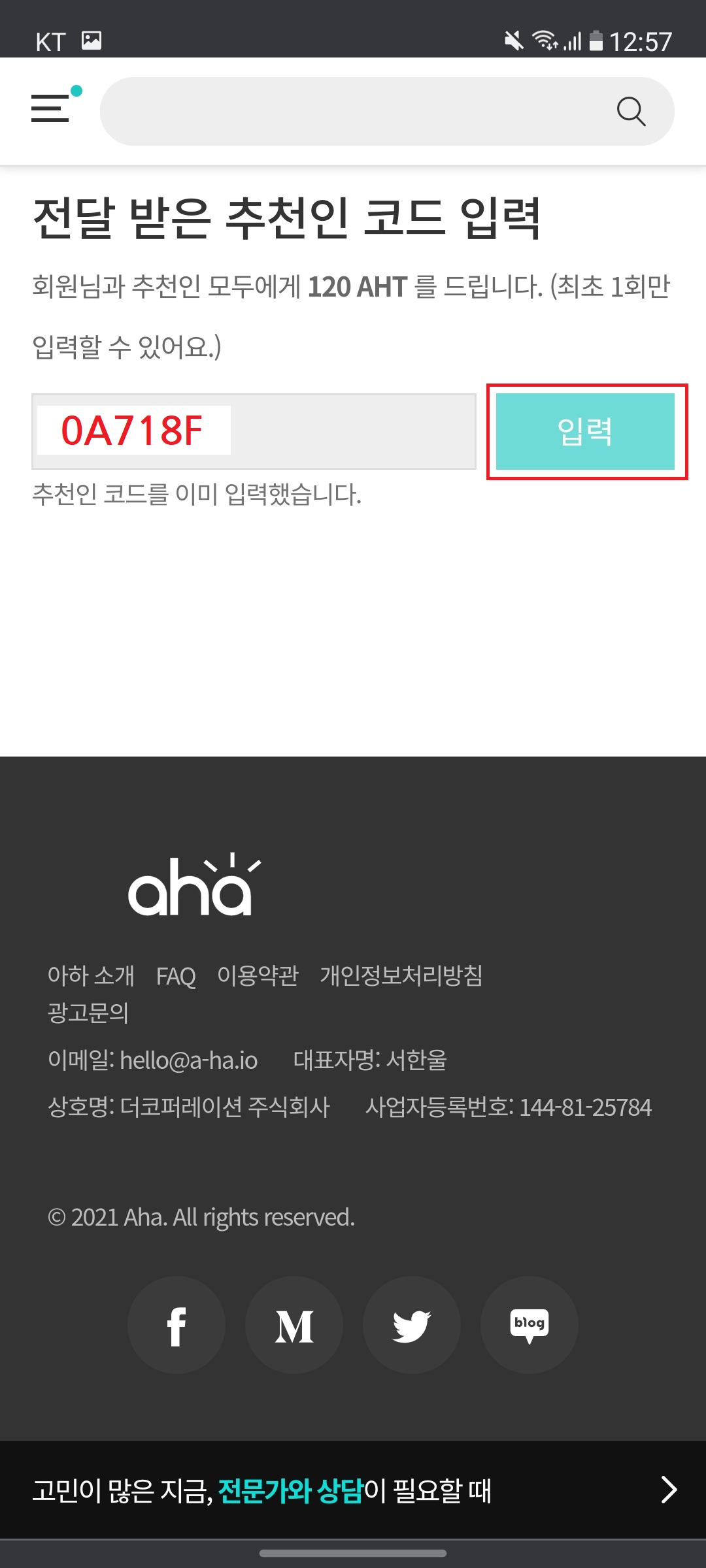 - 추천코드를 입력하면 120AHT가 즉시 적립됩니다 반드시 입력해 주세요!