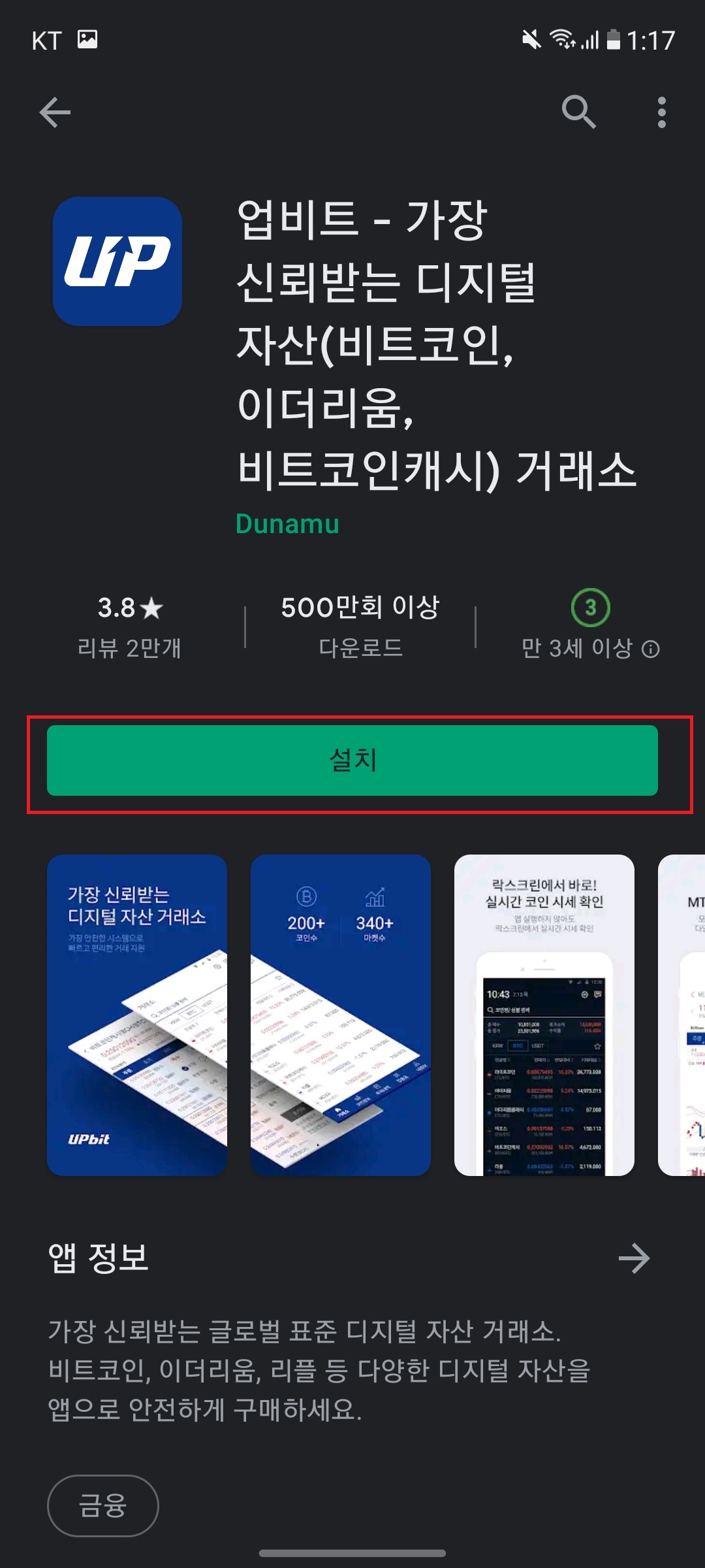 - 안드로이드(구글 플레이) 또는 아이폰(앱 스토어)에서 "업비트"를 검색하여 설치 합니다.