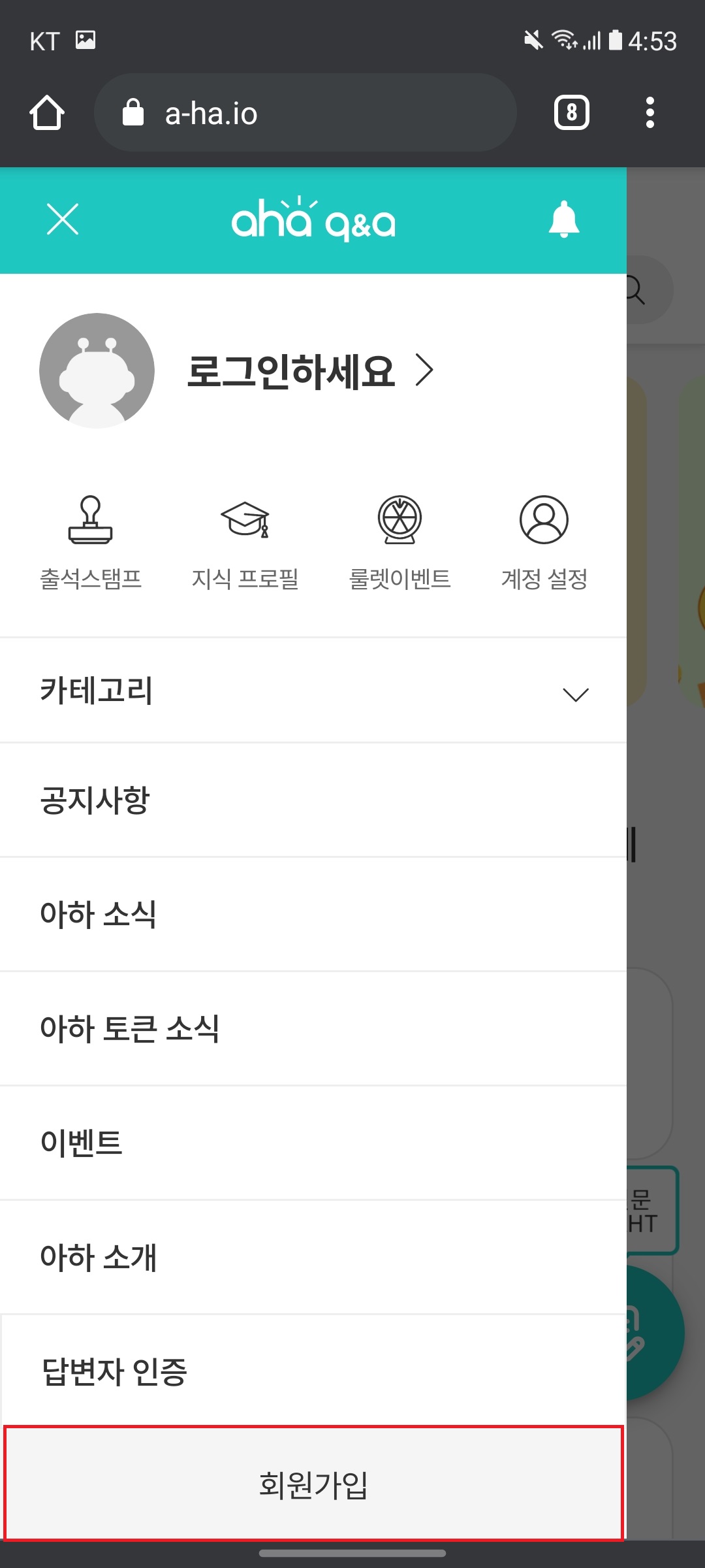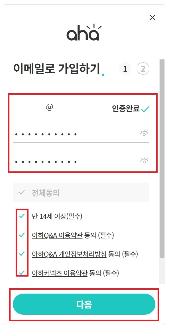 - 좌측메뉴 - 회원가입 - 가입(저는 이메일로 가입하겠습니다. 원하는 가입방식을 선택하셔도 됩니다.) - 이메일 회원가입 - 이메일 입력 - 아하계정(이메일주소, 패스워드, 약관동의) 입력 후 다음 - 인증하고 가입하기