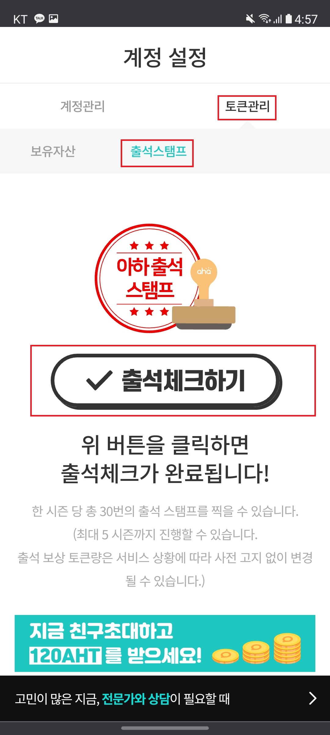 - 좌측상단 - 계정설정 - 토큰관리 - "출석스탬프" 선택 - 확인